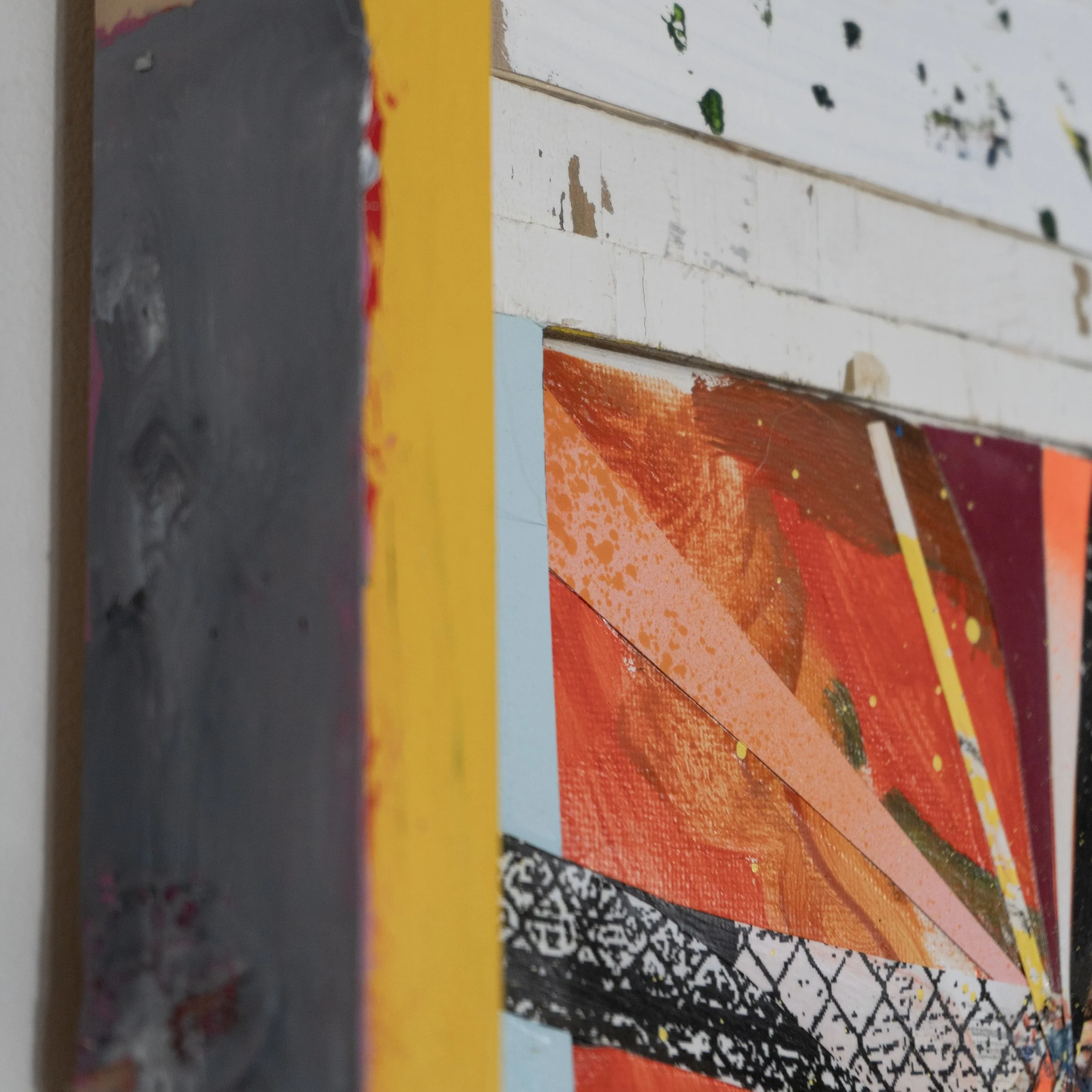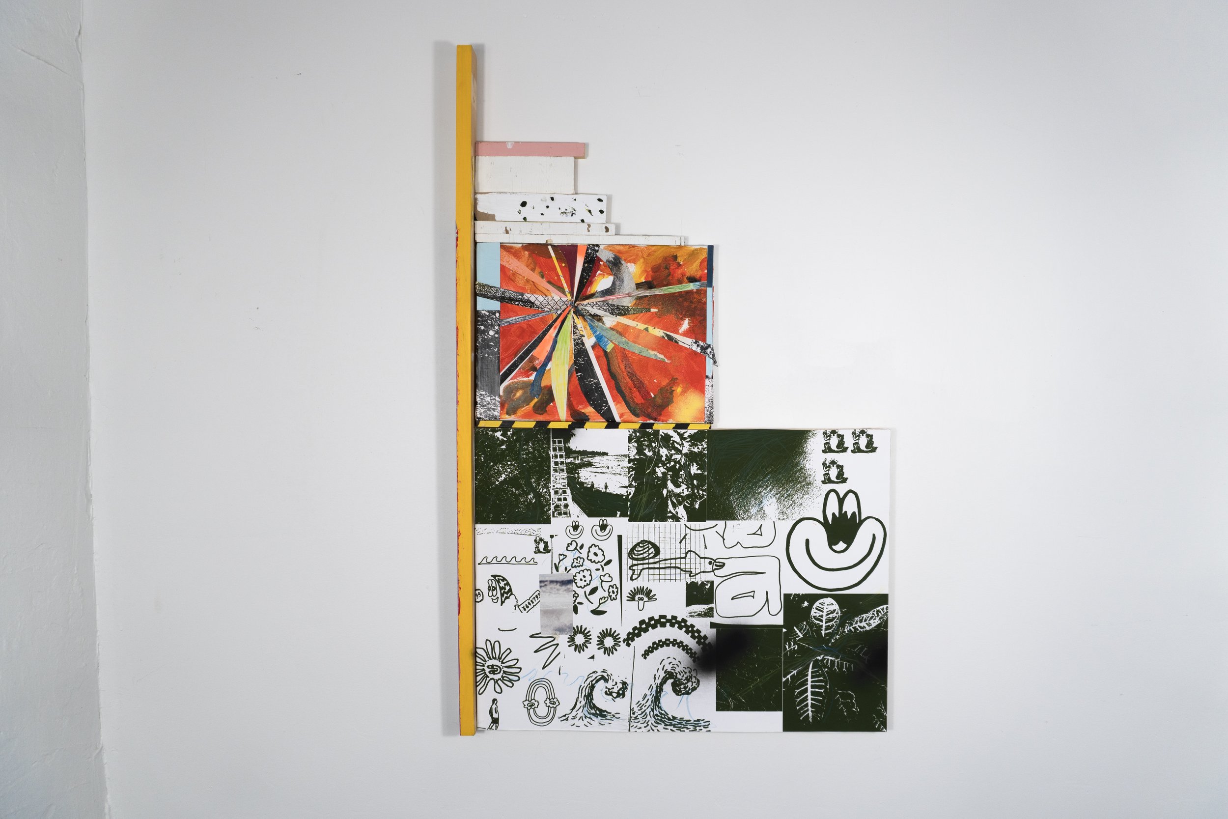 Dolphin Days - 35" x 24" - assemblage, oil, acrylic, paper, wood, spray paint, with printed elements on canvas and wood panel - 2024